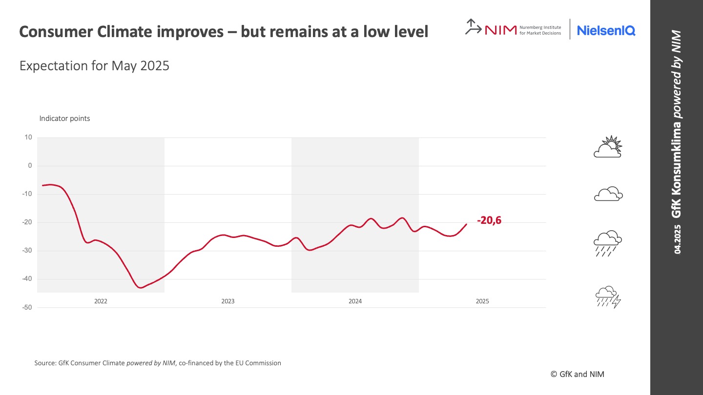 Nuremberg, April 29, 2025 – Consumer sentiment in Germany continues its recovery in April that began in the previous month. Both income expectations and the willingness to buy show noticeable increases, while economic expectations improve only slightly. The willingness to save also declines significantly, thereby supporting the Consumer Climate: The indicator forecasts an increase of 3.7 points to -20.6 points for May 2025 compared with the previous month (revised -24.3 points). These are the findings of the GfK Consumer Climate powered by NIM for March, which has been published jointly by GfK and the Nuremberg Institute for Market Decisions (NIM), the founder of GfK, since October 2023.