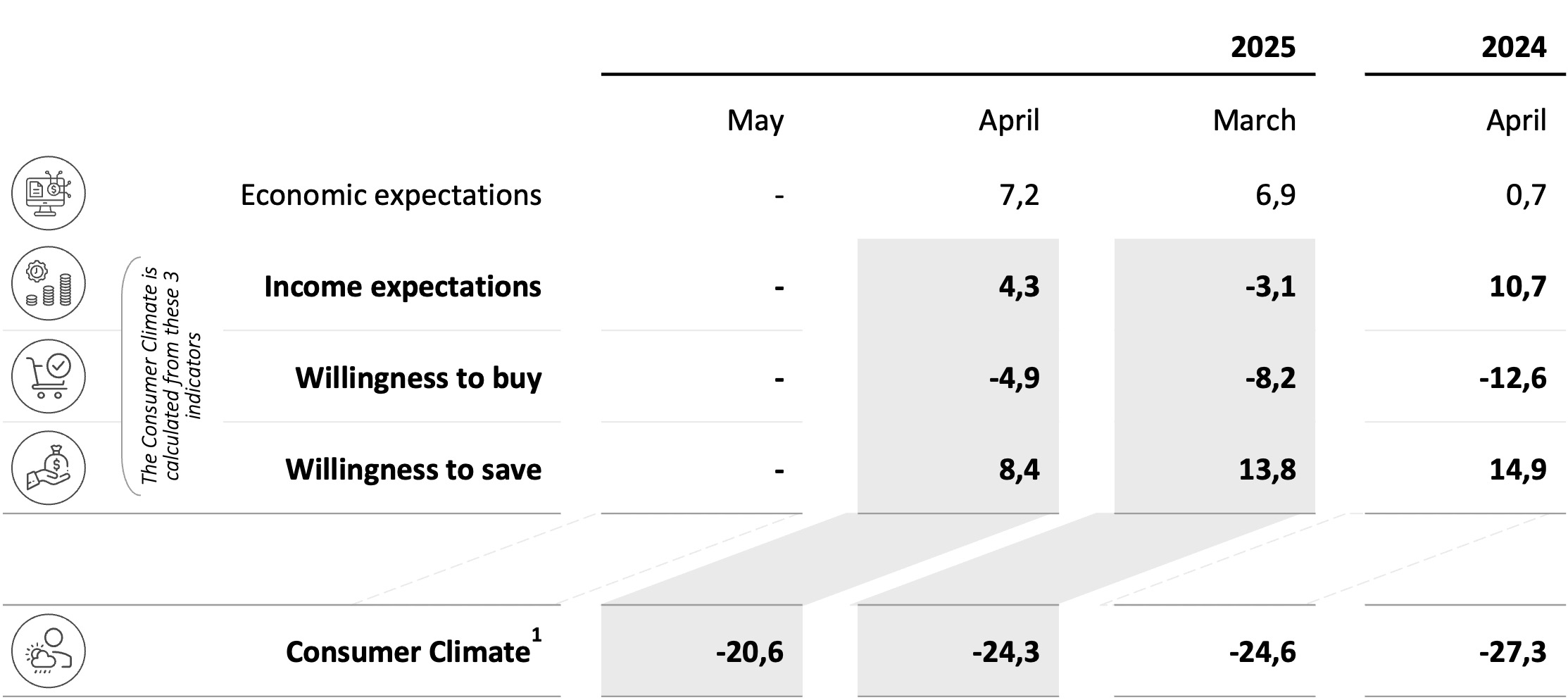1Consumer Climate can be interpreted as a leading indicator of consumer behavior in Germany. Analyses have shown that sentiment is an early indicator for the actual development of private consumption. The Consumer Climate is calculated from the April values for income expectations, willingness to buy and willingness to save - as a leading indicator for the development of consumption in May 2025.