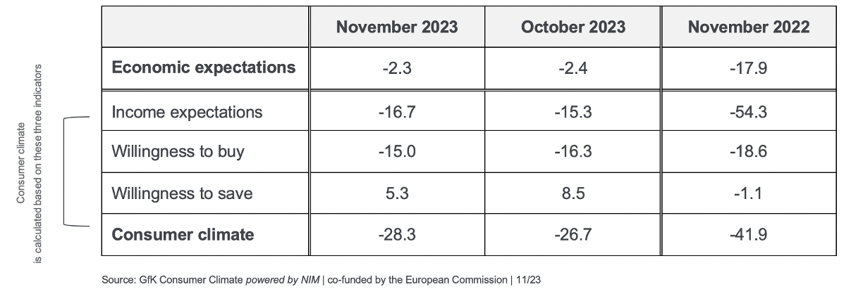Nuremberg, Germany, November 28, 2023 – Consumer sentiment in Germany remains overall stable in November, with no significant changes. Willingness to buy is growing slightly, while income expectations have experienced a slight decline. Economic expectations remain almost unchanged compared to the previous month. The forecast value for the Consumer Climate for December is at -27.8 points, and thus 0.5 points above November (revised to -28.3 points). These are the findings of the GfK Consumer Climate powered by NIM for November 2023. As of October 2023, it is published jointly by GfK and the Nuremberg Institute for Market Decisions (NIM), the founder of GfK.