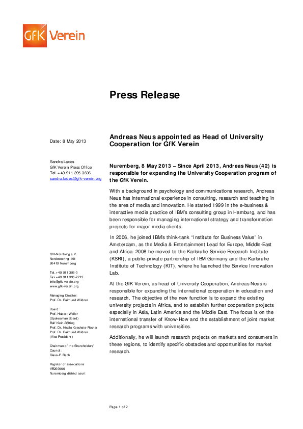 At the GfK Verein, as head of University Cooperation, Andreas Neus is responsible for expanding the international cooperation in education and research. The objective of the new function is to expand the existing university projects in Africa, and to establish further cooperation projects especially in Asia, Latin America and the Middle East. The focus is on the international transfer of Know-How and the establishment of joint market research programs with universities.