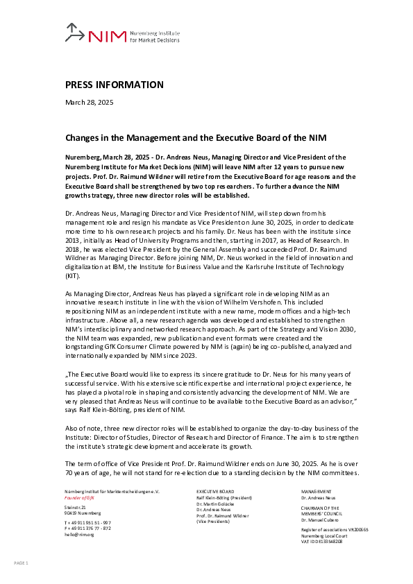 Nuremberg, March 28, 2025 - Dr. Andreas Neus, Managing Director and Vice President of the Nuremberg Institute for Market Decisions (NIM) will leave NIM after 12 years to pursue new projects. Prof. Dr. Raimund Wildner will retire from the Executive Board for age reasons and the Executive Board shall be strengthened by two top researchers. To further advance the NIM growth strategy, three new director roles will be established.