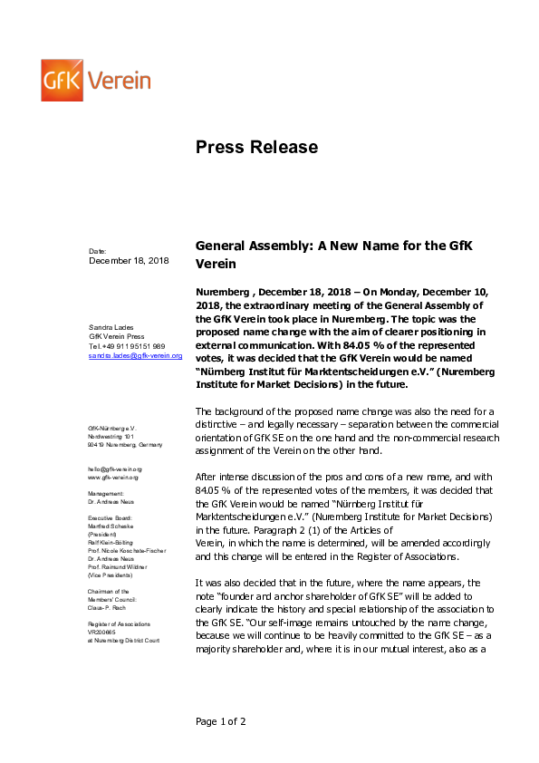 Nuremberg , December 18, 2018 – On Monday, December 10, 2018, the extraordinary meeting of the General Assembly of the GfK Verein took place in Nuremberg. The topic was the proposed name change with the aim of clearer positioning in external communication. With 84.05 % of the represented votes, it was decided that the GfK Verein would be named “Nürnberg Institut für Marktentscheidungen e.V.” (Nuremberg Institute for Market Decisions) in the future.