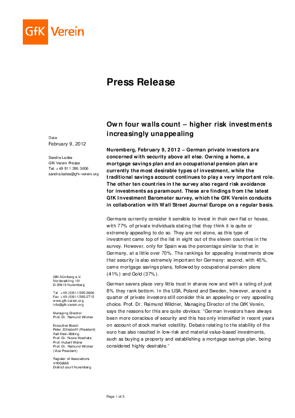 German private investors are concerned with security above all else. Owning a home, a mortgage savings plan and an occupational pension plan are currently the most desirable types of investment, while the traditional savings account continues to play a very important role. The other ten countries in the survey also regard risk avoidance for investments as paramount. These are findings from the latest GfK Investment Barometer survey, which the GfK Verein conducts in collaboration with Wall Street Journal Europe on a regular basis.