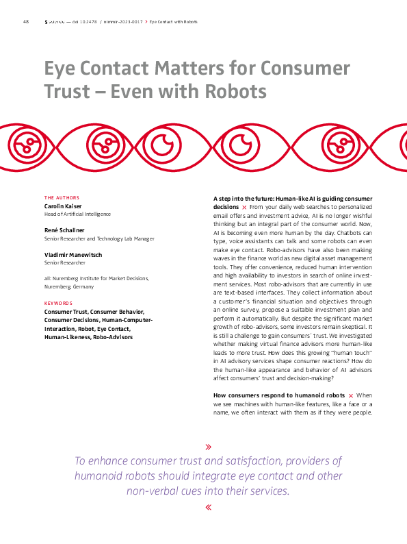 Kaiser, C., Schallner, R., & Manewitsch, V. (2023). Eye Contact Matters for Consumer Trust – Even with Robots. NIM Marketing Intelligence Review, 15(2) 48-53. https://doi.org/10.2478/nimmir-2023-0017