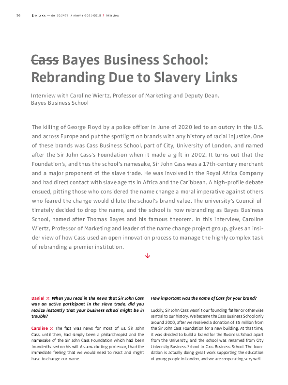 The killing of George Floyd by a police officer in June of 2020 put the spotlight on brands with any history of racial injustice. One of these brands was Cass Business School, part of City, University of London. It turned out that the school’s namesake, Sir John Cass, was a 17th -century merchant and a major proponent of the slave trade. A high-profile debate ensued, pitting those who considered the name change a moral imperative against others who feared the change would dilute the school’s brand value. The university’s Council ultimately decided to drop the name and the school is now rebranding as Bayes Business School. In this interview, Caroline Wiertz, Professor of Marketing and leader of the name change project group, gives an insider view of how Cass used an open innovation process to manage the highly complex task of rebranding a premier institution.