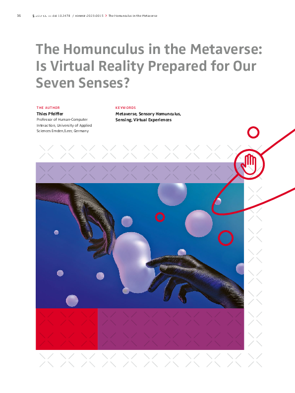 More and more people will likely commute into virtual worlds on a regular basis with the increasing availability of virtual reality devices in consumer markets. However, for the time being, virtual environments only deliver sensory stimulation to a very small subset of human sensory capabilities. The virtual experiences provided today are predominantly visual. If you are lucky, they may be spiced up with some acoustic events. No olfactory, no gustatory and hardly any tactile or kinesthetic stimuli are provided in a systematic manner. If we were to design a homunculus that depicts the adaptation required for the metaverse, it would be quite different from Penfield’s homunculus. In fact, our “Homunculus Metaversensis” for virtual reality could look like the one depicted in Figure 2. Let´s take a closer look at the current “sensory” state of the metaverse and the technologies that stimulate our senses in virtual environments.