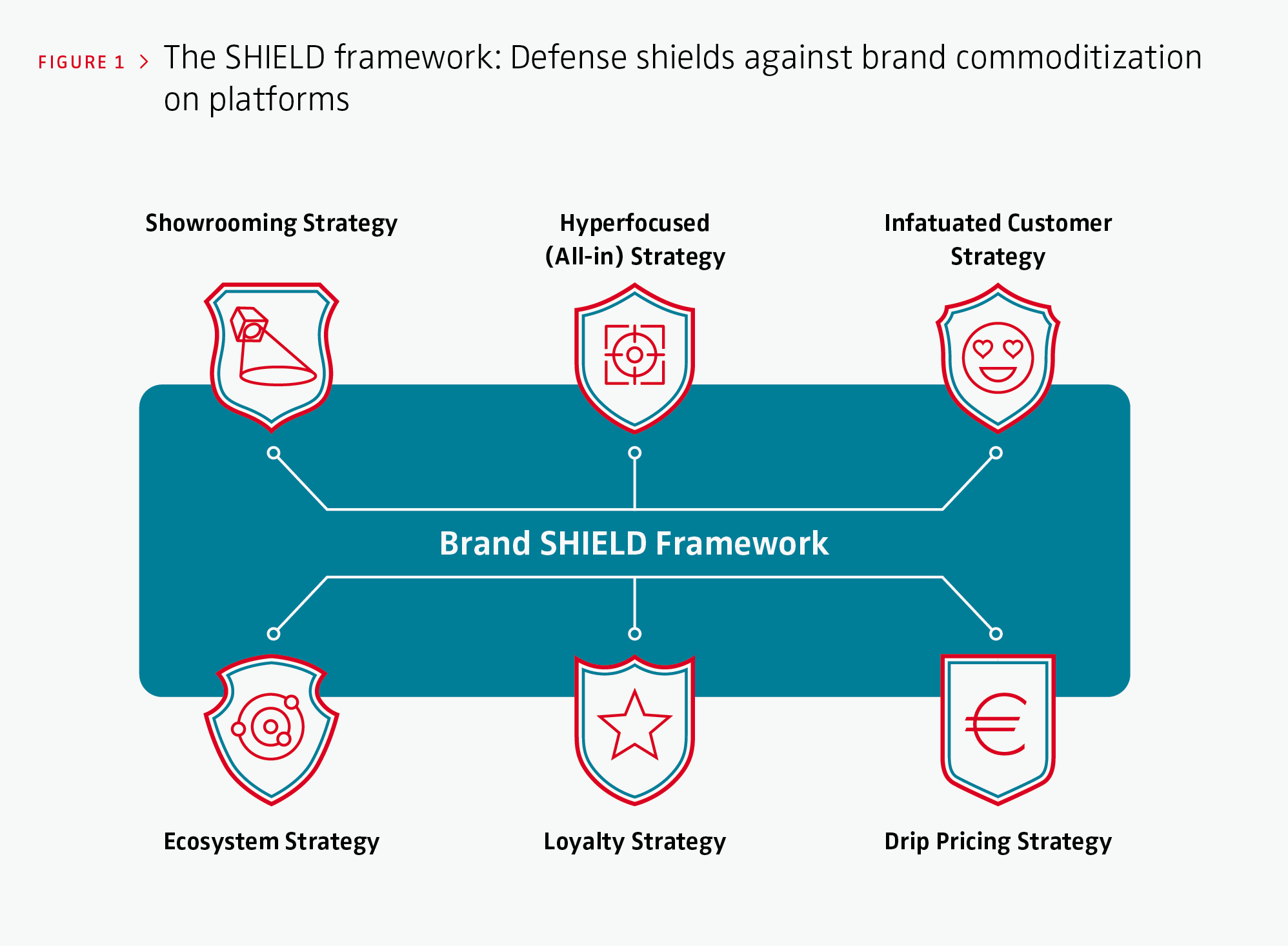 We suggest a comprehensive strategy framework, SHIELD, to help brands navigate and thrive in the competitive landscape of platforms. The SHIELD framework is designed to empower brands to stand out and prosper within the competitive dynamics of platforms. SHIELD symbolizes a robust defense mechanism that enables brands to safeguard their unique identity, foster direct customer engagement and shield against commoditization. Figure 1 illustrates its individual components, which we discuss below.