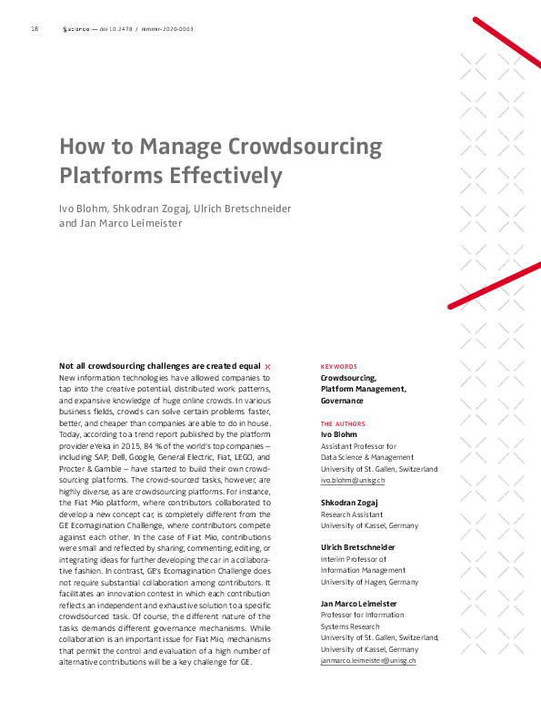 Crowdsourced tasks are very diverse – and so are platform types. They fall into four categories, each demanding different governance mechanisms. The main goal of microtasking crowdsourcing platforms is the scalable and time-efficient batch processing of highly repetitive tasks. Crowdsourcing platforms for information pooling aggregate contributions such as votes, opinions, assessments and forecasts through approaches such as averaging, summation, or visualization. Broadcast search platforms collect contributions to solve tasks in order to gain alternative insights and solutions from people outside the organization, and are particularly suited for solving challenging technical, analytical, scientific, or creative problems. Open collaboration platforms invite contributors to team up to jointly solve complex problems in cases where solutions require the integration of distributed knowledge and the skills of many contributors. Companies establishing crowdsourcing platforms of any type should continuously monitor and adjust their governance mechanisms. Quality and quantity of contributions, project runtime, or the effort for conducting the crowdsourcing project may be good starting points.