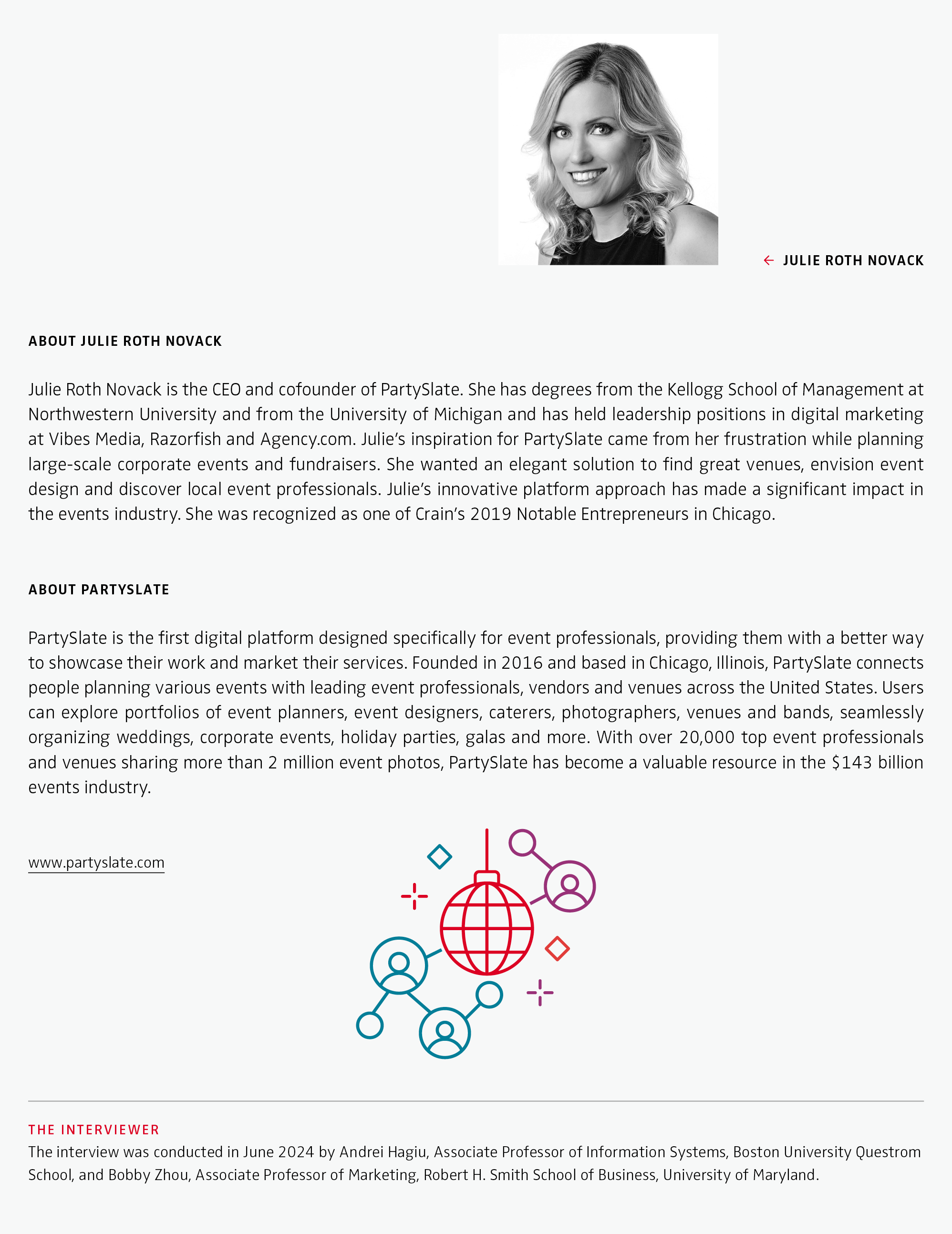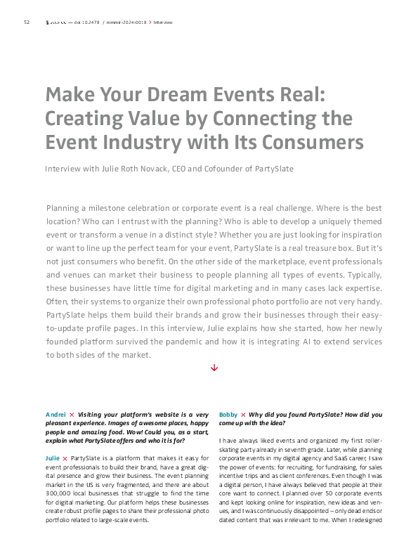Hagiu, A. & Zhou, "Make Your Dream Events Real: Creating Value by Connecting the Event Industry with Its Consumers: Interview with Julie Roth Novack, CEO and Cofounder of PartySlate" NIM Marketing Intelligence Review, vol. 16, no. 2, Sciendo, 2024, pp. 52-57. https://doi.org/10.2478/nimmir-2024-0018