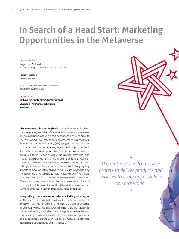 Dwivedi, Y. K., Hughes, L., Wang, Y., Alalwan, A. A., Ahn, S. J., Balakrishnan, J., ... & Wirtz, J. (2022). Metaverse marketing: How the metaverse will shape the future of consumer research and practice. Psychology & Marketing. 1–27. doi.org/10.1002/mar.21767