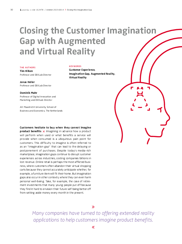 Imagining in advance how a product will perform when used or what benefits a service will provide when consumed is a ubiquitous pain point for customers. This difficulty to imagine is often referred to as an “imagination gap” that can lead to the delaying or postponement of purchases. Despite today’s media-rich marketplace, imagination gaps continue to disrupt customer experiences across industries, costing companies billions in lost revenue. Online retail is perhaps the most afflicted business, where customers often abandon their virtual shopping carts because they cannot accurately anticipate whether, for example, a furniture item will fit their home. But imagination gaps also occur in other contexts, where they can even harm personal well-being. Take, for example, the case of retirement investments that many young people put off because they find it hard to envision their future self being better off from setting aside money every month in the present.