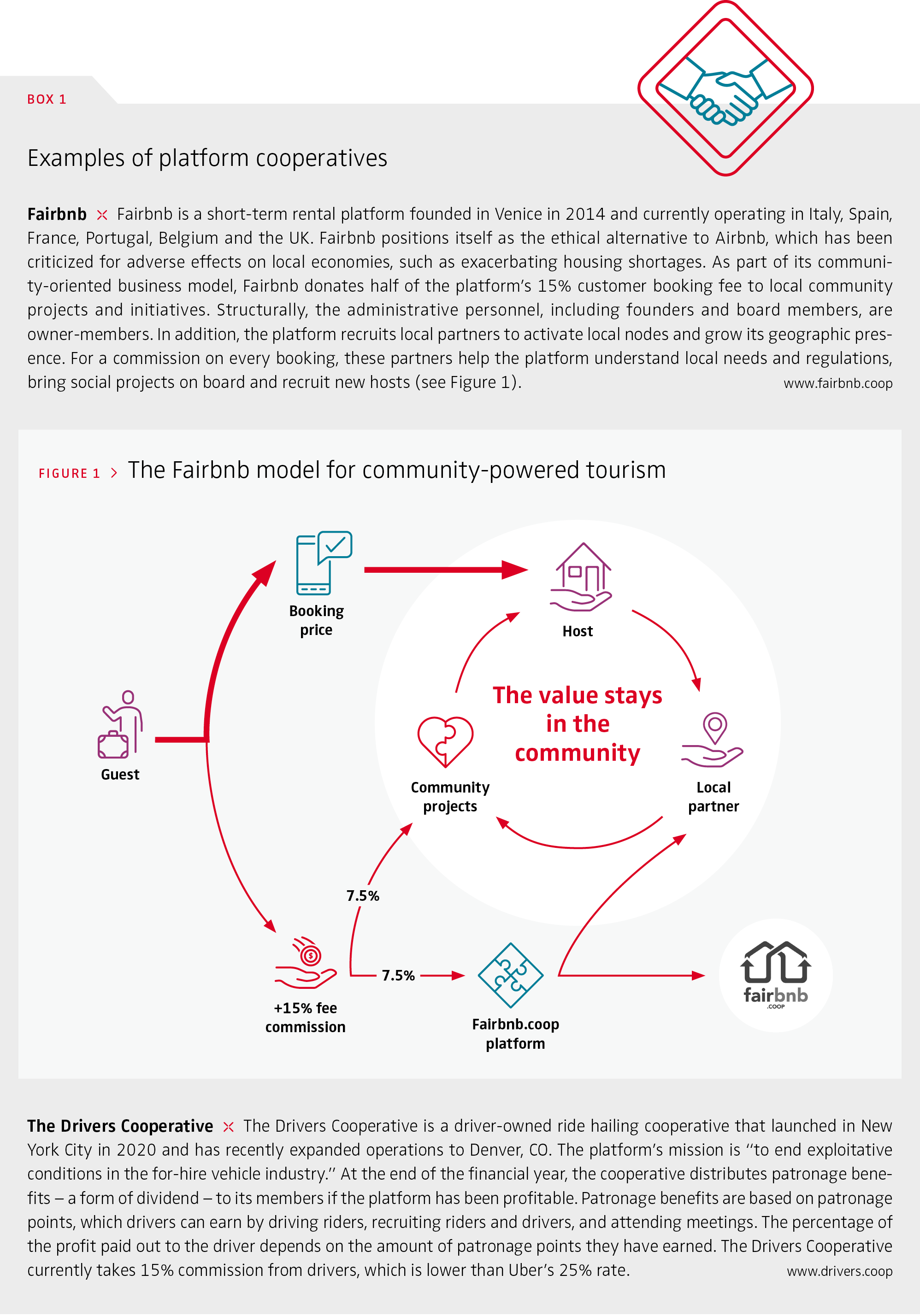 This challenger business model replicates technology developed by mainstream platforms but has ownership models that include employees, consumers or other stakeholders. Platform cooperatives embed solidarity between users and owners and make sure that all stakeholders benefit from innovation and platform efficiencies. They are acknowledged as an egalitarian, communal and sustainable alternative to dominant platforms and a way to reimagine the platform economy. However, funding is often a challenge as platform cooperatives are less attractive to traditional investors because they provide lower returns on investment due to their profit-sharing models. Further, collective decision-making and the heterogeneity of diverse stakeholders can complicate cooperative governance and slow down operations. Direct competition with incumbents is therefore challenging. Box 1 describes two examples of platform cooperatives: Fairbnb in the home-sharing business in several European regions and The Drivers Cooperative, a ride-sharing platform operating in a few US cities.