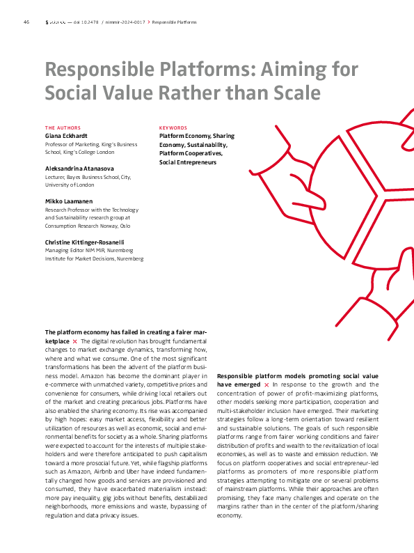 Atanasova, A., Eckhardt, G. M., & Laamanen, M. (2024). Platform cooperatives in the sharing economy: How market challengers bring change from the margins. Journal of the Academy of Marketing Science.