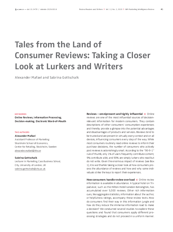While most consumers routinely read online reviews to inform their purchase decisions, the number of consumers who actively post reviews is astonishingly small. To find their way in the review jungle, readers process the information presented very selectively and pursue different objectives. They use different informational cues for their own decision-making, which often reflects rather stable patterns. Writers, too, are often less interested in presenting their experience as objectively as possible as contextual factors play an important role. Similar to the review readers, they act neither uniformly nor without biases. Whether they take up the pen at all depends, among other things, on whether they represent a majority or minority opinion and what image of themselves they want to convey. A profound understanding of the motives of readers and writers is important to improve one’s own rating system and requires special skills in the management of online ratings. Managers need to find ways to convert more lurkers into posters to get a more realistic picture of the experiences.