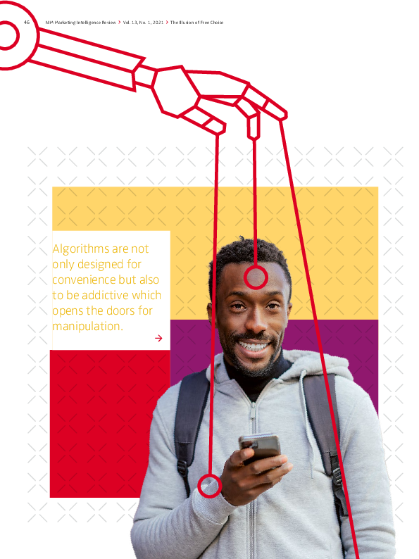 In our augmented world, many decision situations are designed by smart technologies. Artificial intelligence helps reduce information overload, filter relevant information and limit an otherwise overwhelming abundance of choices. While such algorithms make our lives more convenient, they also fulfill various organizational objectives that users may not be aware of and that may not be in their best interest. We do not know whether algorithms truly optimize the benefits of their users or rather the return on investment of a company. They are not only designed for convenience but also to be addictive, and this opens the doors for manipulation. Therefore, augmented decision making undermines the freedom of choice. To limit the threats of augmented decisions and enable humans to be critical towards the outcomes of artificial intelligence–driven recommendations, everybody should develop “algorithmic literacy.” It involves a basic understanding of artificial intelligence and how algorithms work in the background. Algorithmic literacy also requires that users understand the role and value of the personal data they sacrifice in exchange for decision augmentation.
