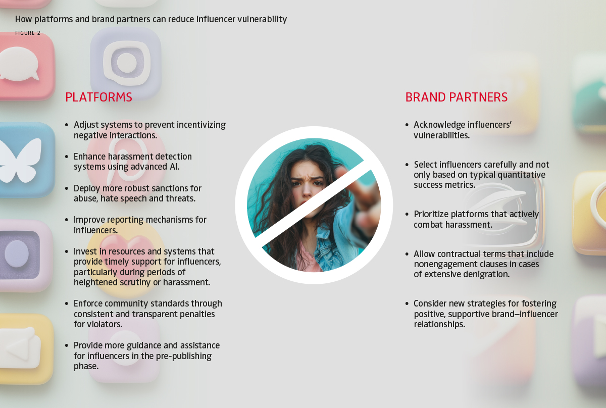 Brands could be aware that influencers’ social media environment can be highly toxic, and that women, people of color and LGBTQ+ influencers face an even higher risk of harassment. Contractual terms should include nonengagement clauses, allowing influencers to distance themselves from harmful interactions or controversies without fearing contract termination. Brand managers could further prefer working with platforms that actively combat harassment and genuinely work on ensuring a supportive environment for their influencer campaigns.