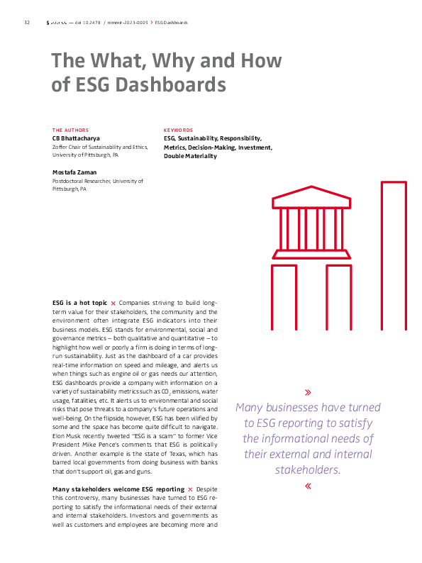 Bhattacharya, C., & Zaman, M. (2023). The What, Why and How of ESG Dashboards. NIM Marketing Intelligence Review, 15(1), 32-39. https://doi.org/10.2478/nimmir-2023-0005
