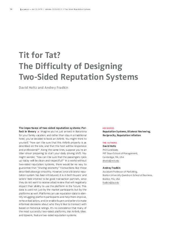 In a two-sided reputation system, it is in the interest of both buyers and sellers to be a good transaction partner. What sounds wonderful in theory is unfortunately not so easy to implement in reality. Reputation systems can have flaws due to factors such as reciprocity and retaliation, selective reviewing, and reputation inflation. These flaws cause the ratings collected on the platform to diverge from the actual experiences that marketplace participants are having. When reputation systems are not thoughtfully designed, it can be hard to distinguish between the “high quality” and “low quality” interactions. This makes it difficult to identify and remove bad actors and increases the chances of a “bad match”. Innovations in reputation system design, such as simultaneous reveal of information, review incentives, and greater reliance on private feedback, are making it easier to implement two-sided systems while avoiding the common pitfalls.