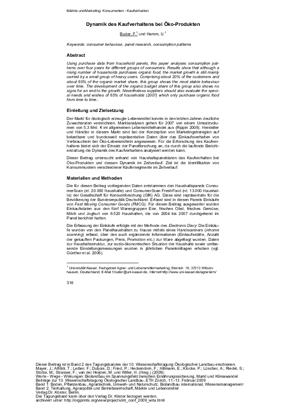 Using purchase data from household panels, this paper analyses consumption patterns over four years for different groups of consumers. Results show that although a rising number of households purchases organic food, the market growth is still mainly carried by a small group of heavy users. Comprising about 20% of the customers and about 65% of the organic market share, this group shows the most stable behavior over time. The development of the organic budget share of this group also shows no signs for an end to the growth. Nevertheless, suppliers should also evaluate the special needs and wishes of 65% of households (2007) which only purchase organic food from time to time.