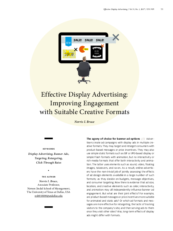Online advertisers have the non-trivial job of jointly assessing the effects of banner ad design elements available in a large number of such formats. Our research found that animated formats are superior to static formats in most settings. It confirms that they can improve engagement, since they can generate higher recall, attract user attention, and create favorability for the advertised brand. Yet, static formats can still be effective when it comes to price ads and re-targeting. Most interestingly, we found that re-targeted ads are effective only if they offer price incentives. Another interesting finding is that the tactic of serving blanks – for instance, for page views from foreign countries – can distort simple measures of campaign effectiveness, such as click-through rates.