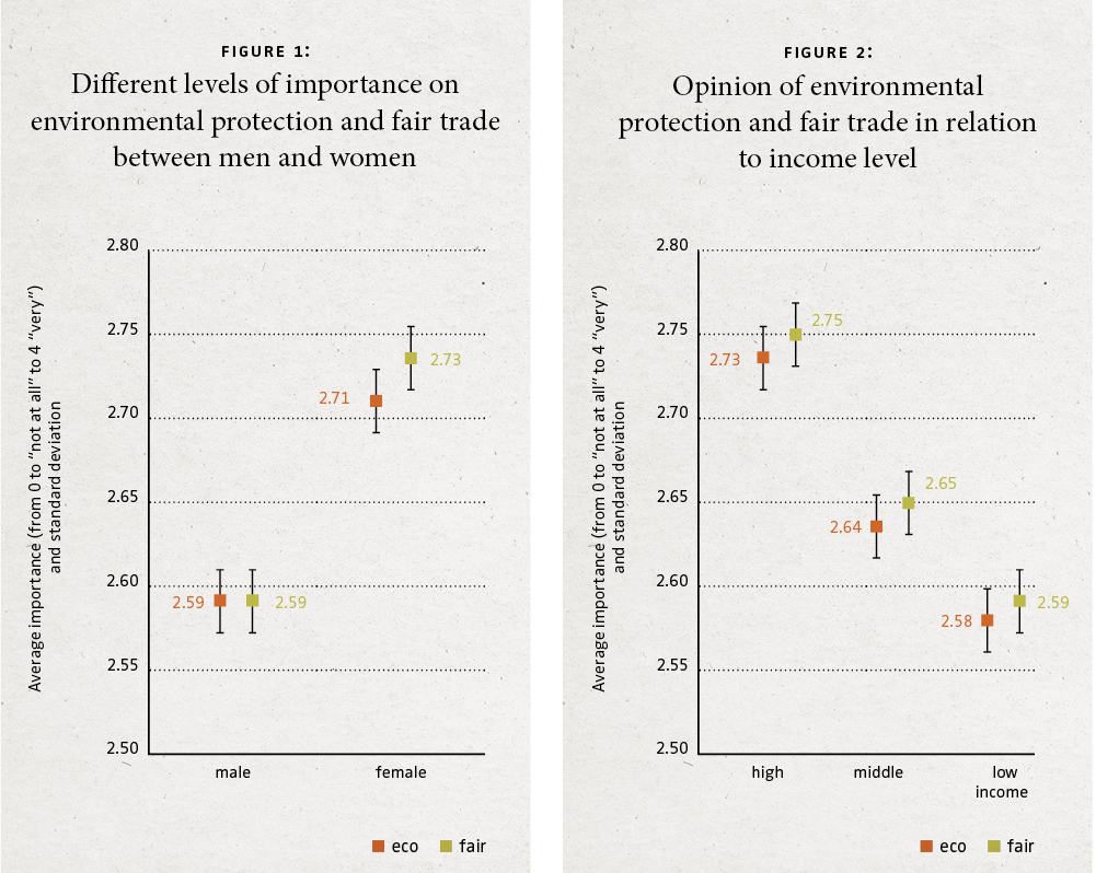 Compared to purchase criteria related to the quality or price of the clothing, environmentally compatible and socially fair conditions play a minor role. For most people (at least 85 %), the most important features they look for in clothes are fit, comfort, good workmanship, ease of care and quality of material. More than 93 % of the respondents are concerned about price and value for money, however only 59 % care about environmental friendliness or socially fair manufacturing and trade conditions. While this percentage is significantly lower, it is still much higher than the panel figure of 25 % of those who bought at least one article of clothing in 2015 with an eco-label as of the time of the survey. Our study therefore confirms the existence of a gap between thought and action. On average, women place more importance on fair trade and environmental protection than men. Furthermore, income also plays a part. High earners are much more likely to take fair trade and environmental protection into consideration than people with an average or lower income (see Figures 1 and 2).
