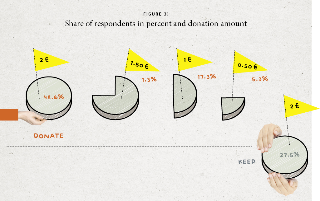 Besides the lack of trust in fair trade seals, socially desirable responding could also contribute to the discrepancy between attitudes and actual purchases. In order to investigate this assumption more closely, we invited the respondents to take part in a small game after the survey and observed their willingness to donate money (see Box 1). Across all the respondents, almost half donated the entire €2 available. 27 % kept the entire amount. 23 % kept part of the money and donated the rest (see Figure 3).
