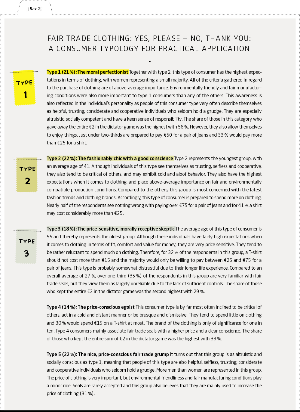 However, what actually moves consumers to buy fair trade or not? Could it be that there are customer segments that more quickly and frequently buy according to ethical criteria than others? Which types of customers have no interest whatsoever in eco products? The GfK Verein conducted a study in order to better understand why there is such a low percentage of fairly traded clothing (see Box 1).