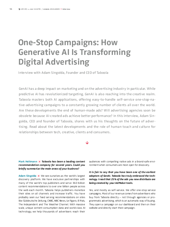 GenAI has a deep impact on marketing and on the advertising industry in particular. While predictive AI has revolutionized targeting, GenAI is also reaching into the creative realm. Taboola masters both AI applications, offering easy-to-handle self-service one-stop-native-advertising campaigns to a constantly growing number of clients all over the world. Are these developments the end of human-made ads? Will advertising agencies soon be obsolete because AI-created ads achieve better performance? In this interview, Adam Singolda, CEO and founder of Taboola, shares with us his thoughts on the future of advertising. Read about the latest developments and the role of human touch and culture for relationships between tech, creative, clients and consumers.