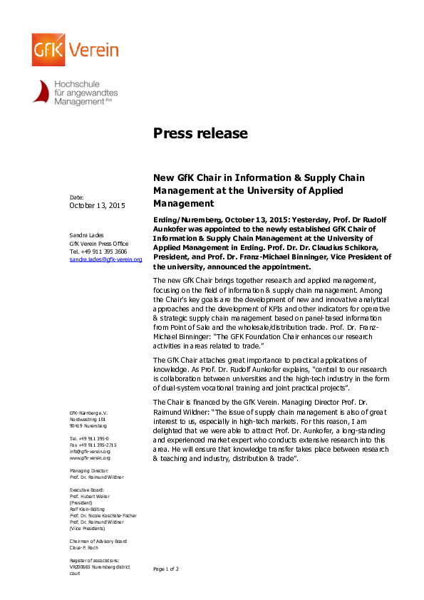 The Chair is financed by the GfK Verein. Managing Director Prof. Dr. Raimund Wildner: “The issue of supply chain management is also of great interest to us, especially in high-tech markets. For this reason, I am delighted that we were able to attract Prof. Dr. Aunkofer, a long-standing and experienced market expert who conducts extensive research into this area. He will ensure that knowledge transfer takes place between research & teaching and industry, distribution & trade”.