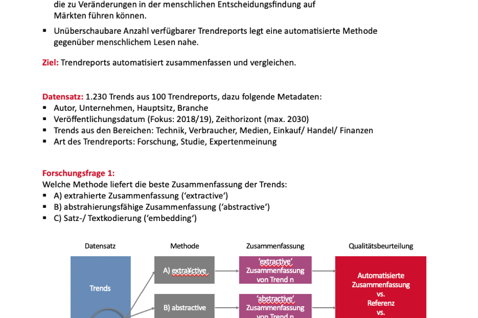 The early recognition and assessment of trends is an important factor in understanding the right research questions and changes in markets. Indeed, by now, many trend reports are published, but the effort to read and analyse them all would be prohibitively high. By using new insights and algorithms in natural language processing and machine learning, we will summarize trends from over 100 selected trend reports. We want to use the findings to develop our own trend radar that tracks down developments in technology and society that have the potential to change market decisions.