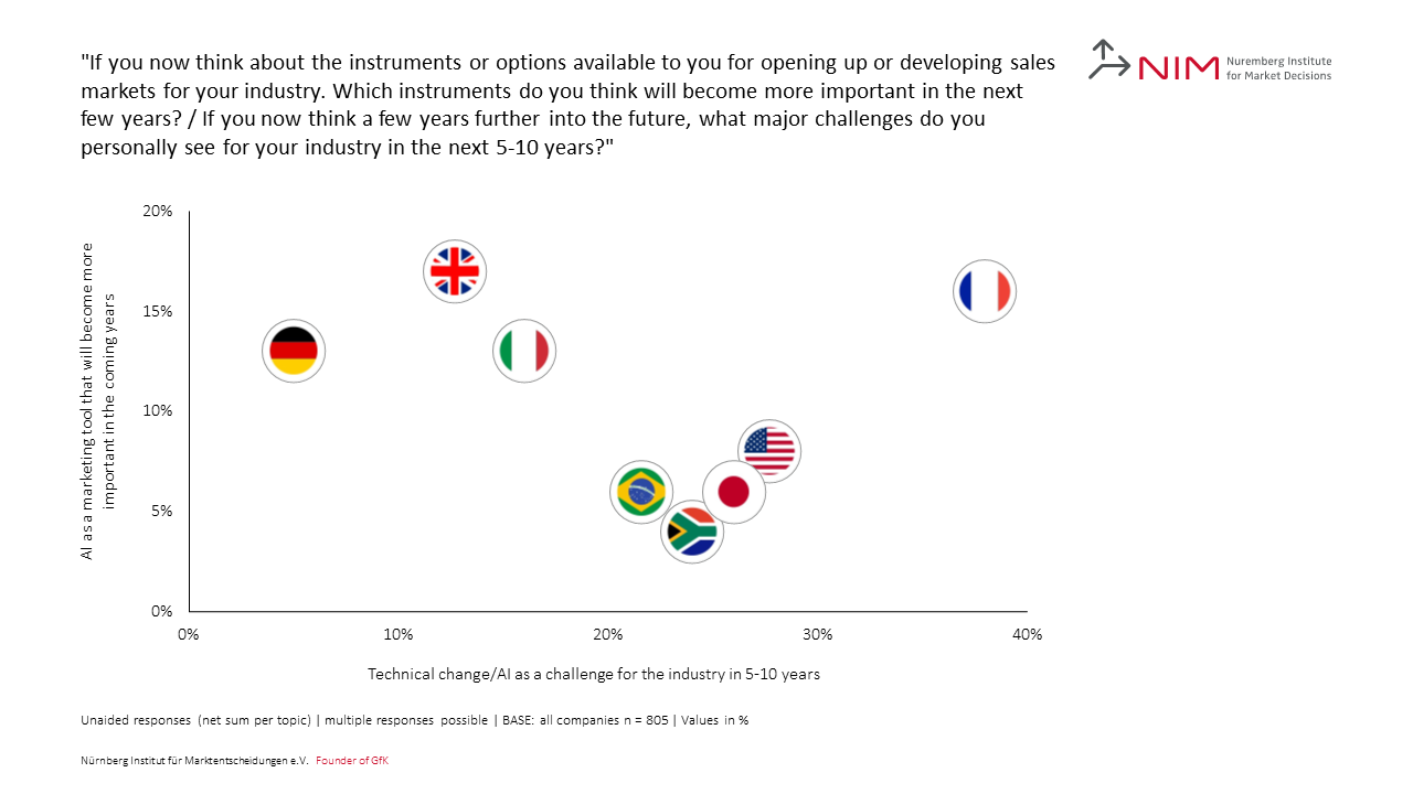 - Managers in European countries are more likely to explicitly mention artificial intelligence in the context of marketing tools. Decision-makers in the USA, Japan, Brazil and South Africa, on the other hand, see technical change and automation more as a future challenge for their industry.