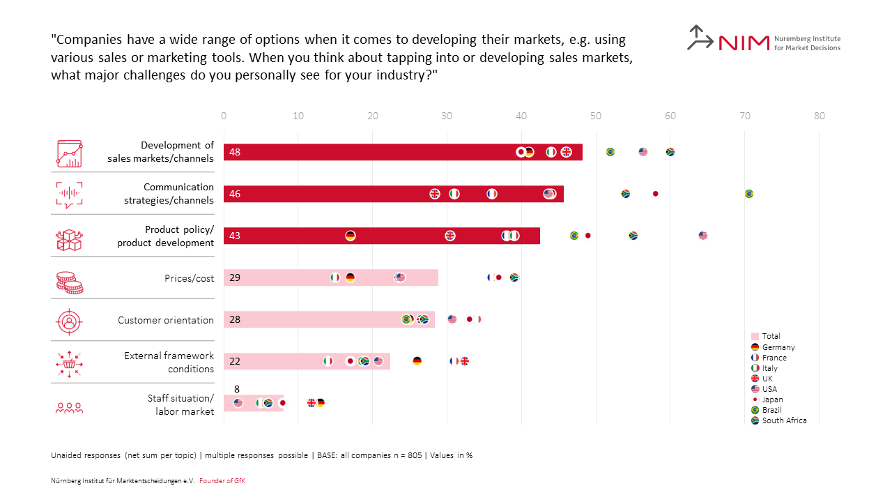 - The urgency of these current challenges varies from country to country, as this international study also reveals. While marketing decision-makers in Germany, for example, are the most relaxed about product policy and product development, those in the USA are comparatively more concerned.