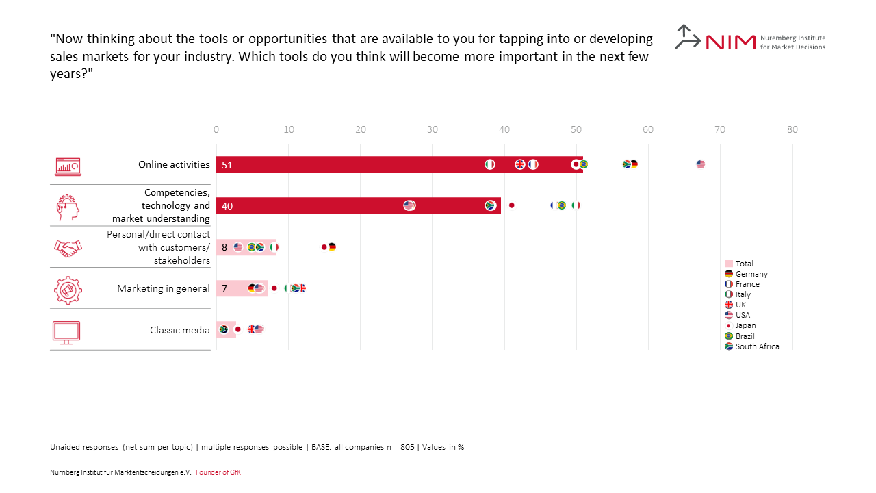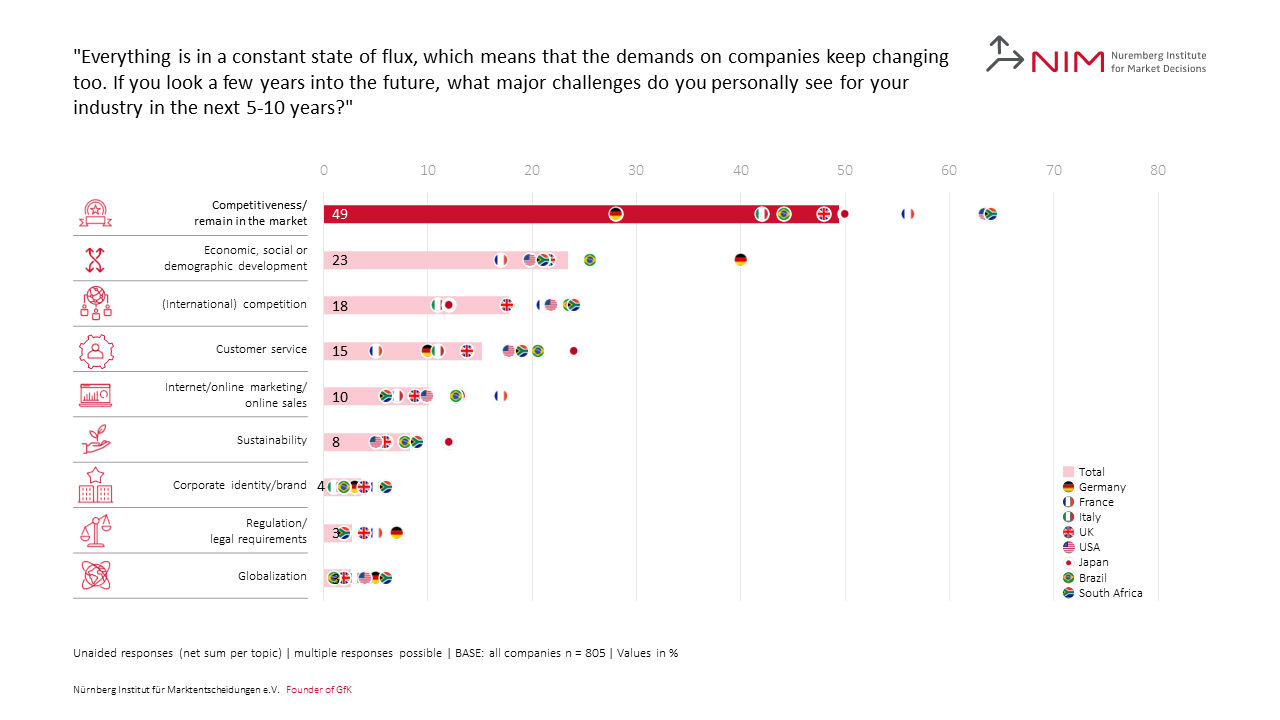 The NIM is thus not only continuing the "Marketing Challenges" study series, which the institute last conducted in 2019, but is also extending the analysis to an international context. Marketing decision-makers in companies based in Germany, France, Italy, the UK, the USA, Japan, Brazil and South Africa were included.