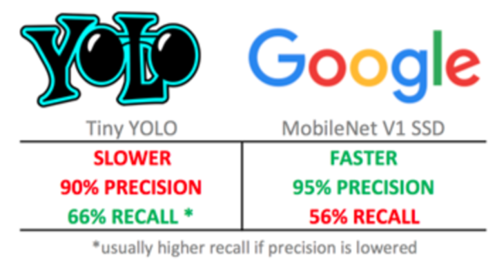 The following comparison is effective, but it is not a fair one. Both models under test stem from base models trained on different datasets (Pascal VOC for Tiny YOLO vs. MSCOCO for MobileNets), and we might not have done a perfect job in fine-tuning either of them. However, we did our best to get reasonably good performance out of both models and to select reasonable parameters when testing.