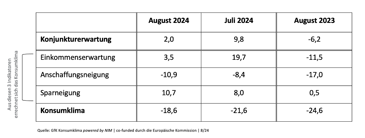 Der Befragungszeitraum für die aktuelle Analyse war vom 1. bis zum 12. August 2024. Die Ergebnisse sind ein Auszug aus der Studie „GfK Konsumklima powered by NIM“ und basieren auf monatlich rund 2.000 Verbraucherinterviews, die im Auftrag der EU-Kommission durchgeführt werden. In diesem Report werden die Indikatoren grafisch aufbereitet und kurz kommentiert. Das Konsumklima bezieht sich explizit auf die gesamten privaten Konsumausgaben. Der Einzelhandel macht jedoch – je nach Abgrenzung – lediglich etwa 30 Prozent der privaten Konsumausgaben aus. Der Rest sind Dienstleistungen, Reisen, Miete, Gesundheitsdienstleistungen sowie der gesamte Wellness-Bereich. Auch hierbei geht es nicht um die Einzelhandelsumsätze, sondern um die gesamten Konsumausgaben der Verbraucher. Die Anschaffungsneigung ist – wie alle anderen Indikatoren auch – ein Stimmungsindikator. Sie fragt, ob die Verbraucher es derzeit für ratsam halten, größere Anschaffungen zu tätigen. Selbst wenn sie dies mit „Ja“ beantworten, müssen noch zwei weitere Voraussetzungen für einen Kauf vorhanden sein: Der Verbraucher muss das nötige Geld für eine solche größere Anschaffung besitzen und auch eine Notwendigkeit für diese Anschaffung sehen. Zudem handelt es sich hier tatsächlich ausschließlich um langlebige Gebrauchsgüter, die auch ein größeres Budget erfordern.