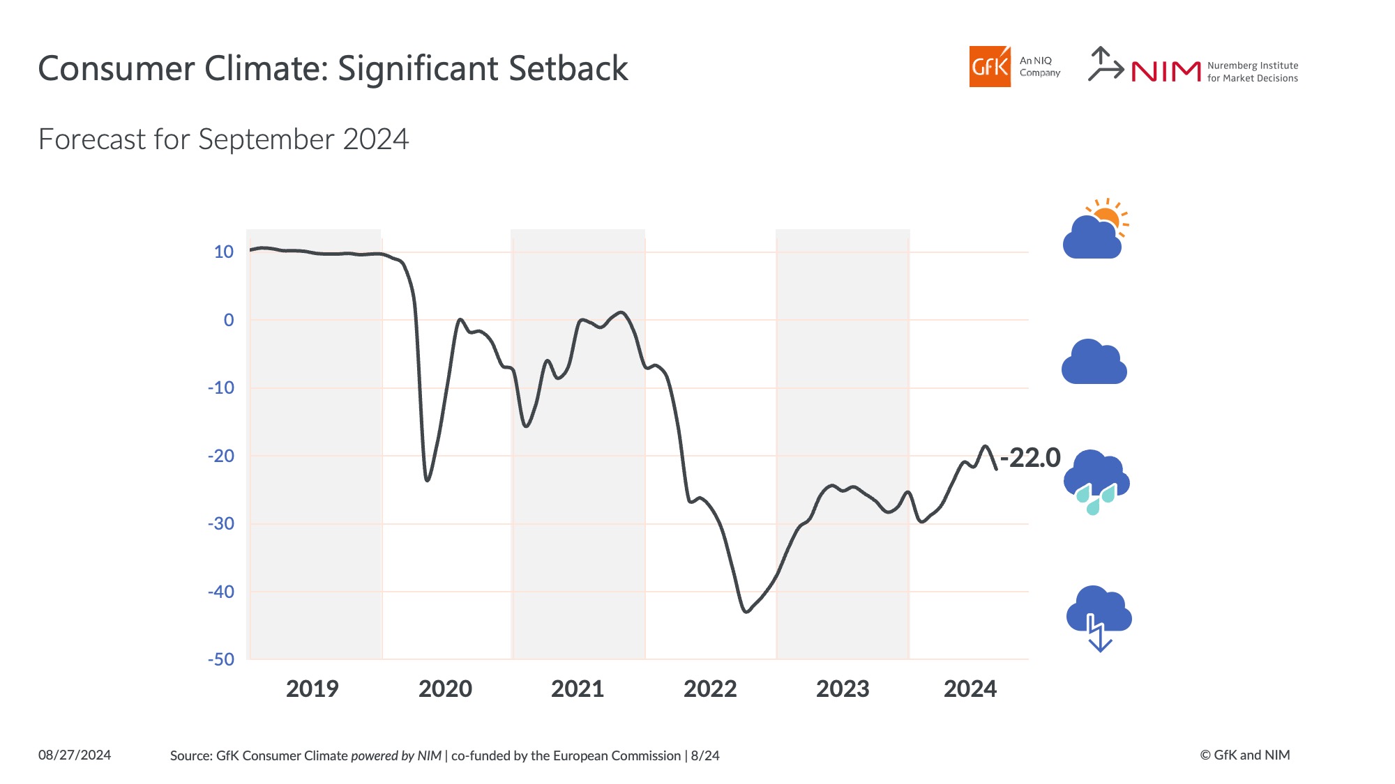 Das seit 1974 regelmäßig und seit 1980 monatlich erhobene GfK Konsumklima gilt als wichtiger Indikator für das Konsumverhalten der Verbraucher und als Wegweiser für die konjunkturelle Entwicklung Deutschlands. Seit Oktober 2023 werden die von GfK erhobenen Daten des Konsumklimas gemeinsam mit dem Nürnberg Institut für Marktentscheidungen e. V. (NIM), Gründer der GfK, ausgewertet und herausgegeben. `Gemeinsam kann noch stärker in die Analyse und Entwicklung der Konsumklimastudie investiert werden, um die Hintergründe der Veränderungen im Verbrauchervertrauen noch besser zu verstehen.