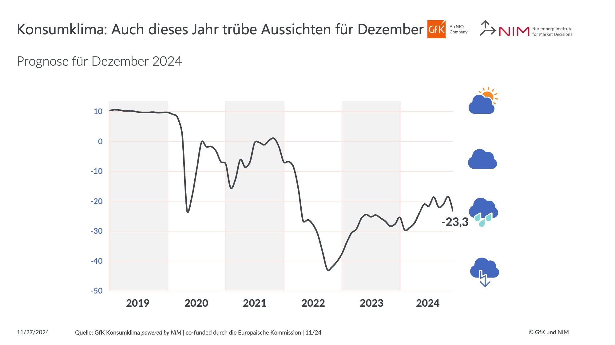 Nürnberg, 27. November 2024 – Die Verbraucherstimmung in Deutschland hat sich im November spürbar eingetrübt: Die Einkommenserwartung verliert deutlich und die Anschaffungsneigung verzeichnet leichte Rückgänge. Da gleichzeitig die Sparneigung ansteigt, geht die Prognose für den letzten Monat dieses Jahres deutlich zurück. Für Dezember wird für das Konsumklima im Vergleich zum Vormonat (revidiert -18,4 Punkte) ein Rückgang von 4,9 Zählern auf -23,3 Punkte gemessen – es befindet sich damit auf ähnlichem Niveau wie im Dezember 2023. Auch zur Entwicklung der allgemeinen Wirtschaftslage äußern sich die deutschen Verbraucher zum vierten Mal in Folge pessimistischer. Dies zeigen die aktuellen Ergebnisse des GfK Konsumklimas powered by NIM. Es wird seit Oktober 2023 gemeinsam von GfK und dem Nürnberg Institut für Marktentscheidungen (NIM), Gründer der GfK, herausgegeben.
