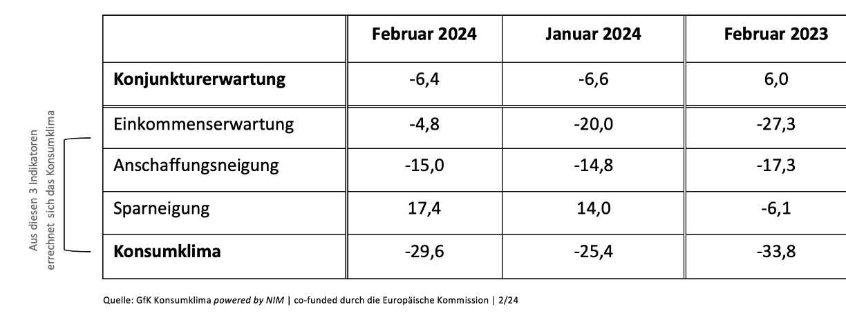 Der Befragungszeitraum für die aktuelle Analyse war vom 1. bis zum 12. Februar 2024. Die Ergebnisse sind ein Auszug aus der Studie „GfK Konsumklima powered by NIM“ und basieren auf monatlich rund 2.000 Verbraucherinterviews, die im Auftrag der EU-Kommission durchgeführt werden. In diesem Report werden die Indikatoren grafisch aufbereitet und kurz kommentiert. Das Konsumklima bezieht sich explizit auf die gesamten privaten Konsumausgaben. Der Einzelhandel macht jedoch – je nach Abgrenzung – lediglich etwa 30 Prozent der privaten Konsumausgaben aus. Der Rest sind Dienstleistungen, Reisen, Miete, Gesundheitsdienstleistungen sowie der gesamte Wellness-Bereich. Auch hierbei geht es nicht um die Einzelhandelsumsätze, sondern um die gesamten Konsumausgaben der Verbraucher. Die Anschaffungsneigung ist – wie alle anderen Indikatoren auch – ein Stimmungsindikator. Sie fragt, ob die Verbraucher es derzeit für ratsam halten, größere Anschaffungen zu tätigen. Selbst wenn sie dies mit „Ja“ beantworten, müssen noch zwei weitere Voraussetzungen für einen Kauf vorhanden sein: Der Verbraucher muss das nötige Geld für eine solche größere Anschaffung besitzen und auch eine Notwendigkeit für diese Anschaffung sehen. Zudem handelt es sich hier tatsächlich ausschließlich um langlebige Gebrauchsgüter, die auch ein größeres Budget erfordern.
