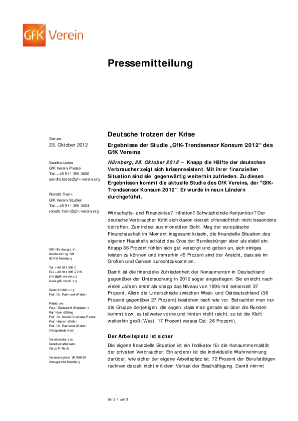 Deutsche trotzen der Krise – Ergebnisse der Studie „GfK-Trendsensor Konsum 2012“ des GfK Vereins