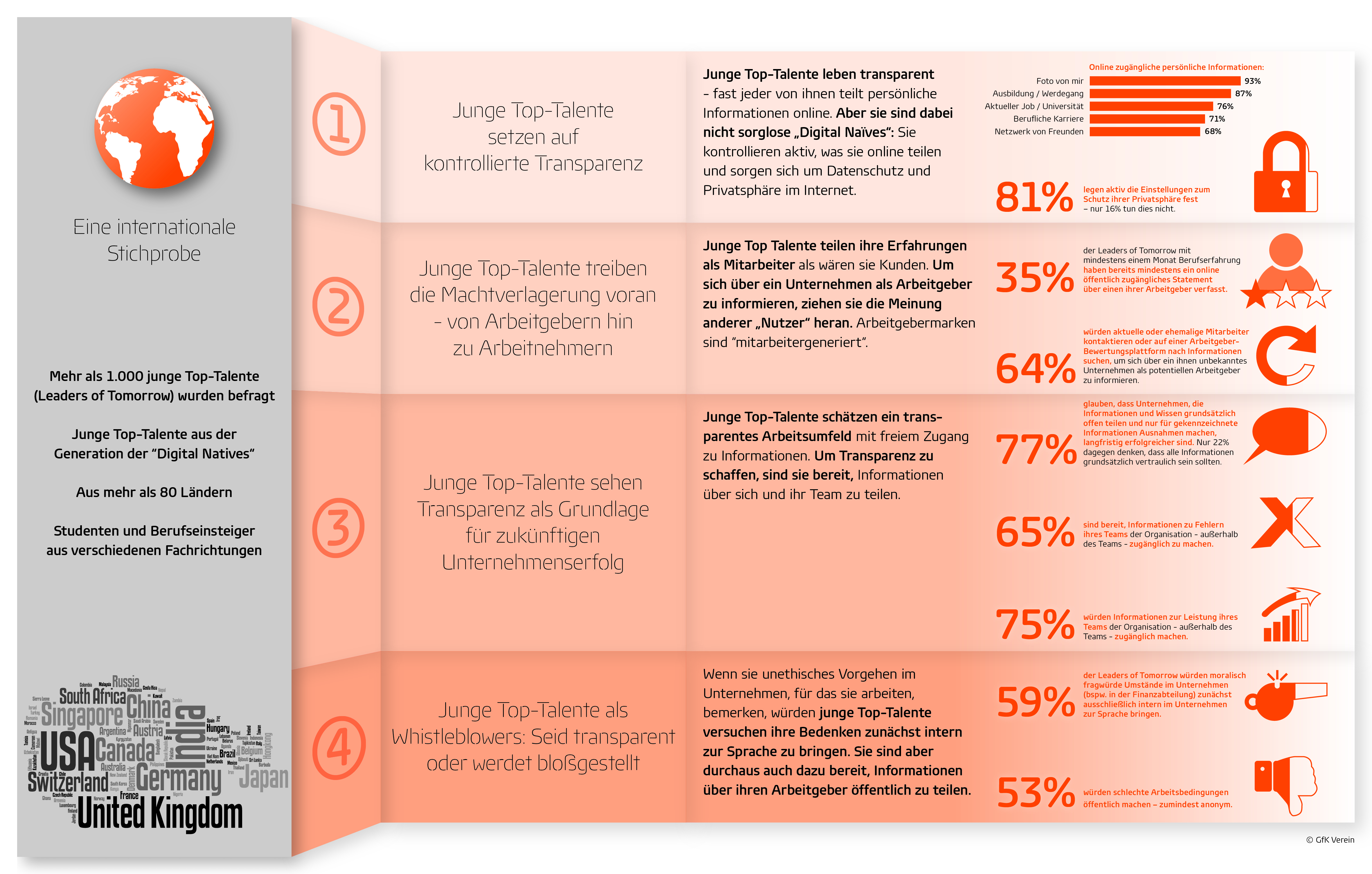 Nürnberg/St. Gallen, 02. Mai 2017 – Kontrollierte Transparenz ist in den Augen junger Toptalente ein wichtiger Erfolgsfaktor. Unternehmen mit einer Kultur, in der Informationen frei fließen können und Vertraulichkeit die Ausnahme ist, profitieren ihrer Meinung nach langfristig. Leaders of Tomorrow fordern nicht völlige Offenheit, sondern wägen ab, welche Informationen nutzbringend geteilt werden können. Bei ihren eigenen Profilen kontrollieren sie genau, was sie online preisgeben und was nicht. So erschaffen sie sich in der digitalen Welt eine professionelle Identität zum Selbstmarketing. Das sind zwei der vier Kernthesen der Studie „Global Perspectives Barometer 2017 – Voices of the Leaders of Tomorrow“ für die der GfK Verein und das St. Gallen Symposium über 1.000 Toptalente aus mehr als 80 Ländern befragt hat.