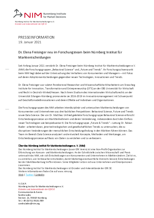 Seit Anfang Januar 2021 verstärkt Dr. Elena Freisinger beim Nürnberg Institut für Marktentscheidungen e.V. (NIM) die Forschungsgruppen „Behavioral Science“ und „Future and Trends“. Ihr Forschungsschwerpunkt beim NIM liegt dabei auf der Untersuchung des Verhaltens von Konsumenten und Managern – mit Fokus auf deren Adaptionsentscheidungen gegenüber neuen Technologien, Innovationen und Trends.
