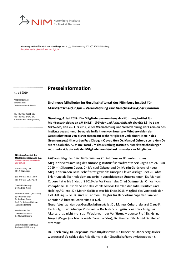 Auf Vorschlag des Präsidiums wurden im Rahmen der 85. ordentlichen Mitgliederversammlung des Nürnberg Institut für Marktentscheidungen am 26. Juni 2019 mit Xiaoqun Clever, Dr. Manuel Cubero und Dr. Martin Golücke drei neue Mitglieder in den Gesellschafterrat gewählt: Xiaoqun Clever verfügt über 20 Jahre Erfahrung als Technologiemanagerin in verschiedenen Unternehmen; Dr. Manuel Cubero hatte bis Ende Juni 2019 die Positionen des Chief Commercial Officer von Vodaphone Deutschland und des Vorstandsvorsitzenden der Kabel Deutschland Holding AG inne; Dr. Martin Golücke war bis Ende 2018 Mitglied des Vorstands der Lidl Stiftung & Co. KG und ist Lehrbeauftragter für Handelsmanagement an der Christian-Albrechts-Universität in Kiel.