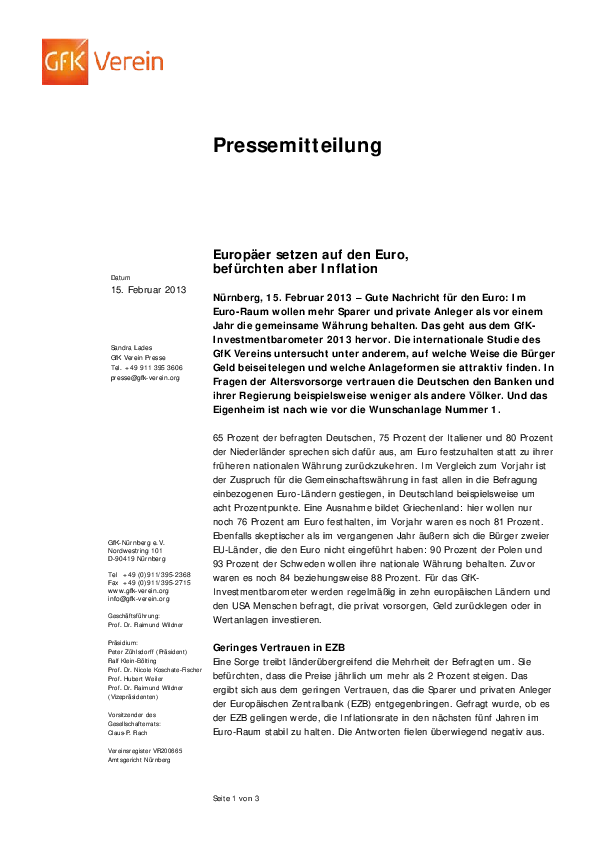 Gute Nachricht für den Euro: Im Euro-Raum wollen mehr Sparer und private Anleger als vor einem Jahr die gemeinsame Währung behalten. Das geht aus dem GfK-Investmentbarometer 2013 hervor. Die internationale Studie des GfK Vereins untersucht unter anderem, auf welche Weise die Bürger Geld beiseitelegen und welche Anlageformen sie attraktiv finden. In Fragen der Altersvorsorge vertrauen die Deutschen den Banken und ihrer Regierung beispielsweise weniger als andere Völker. Und das Eigenheim ist nach wie vor die Wunschanlage Nummer 1.