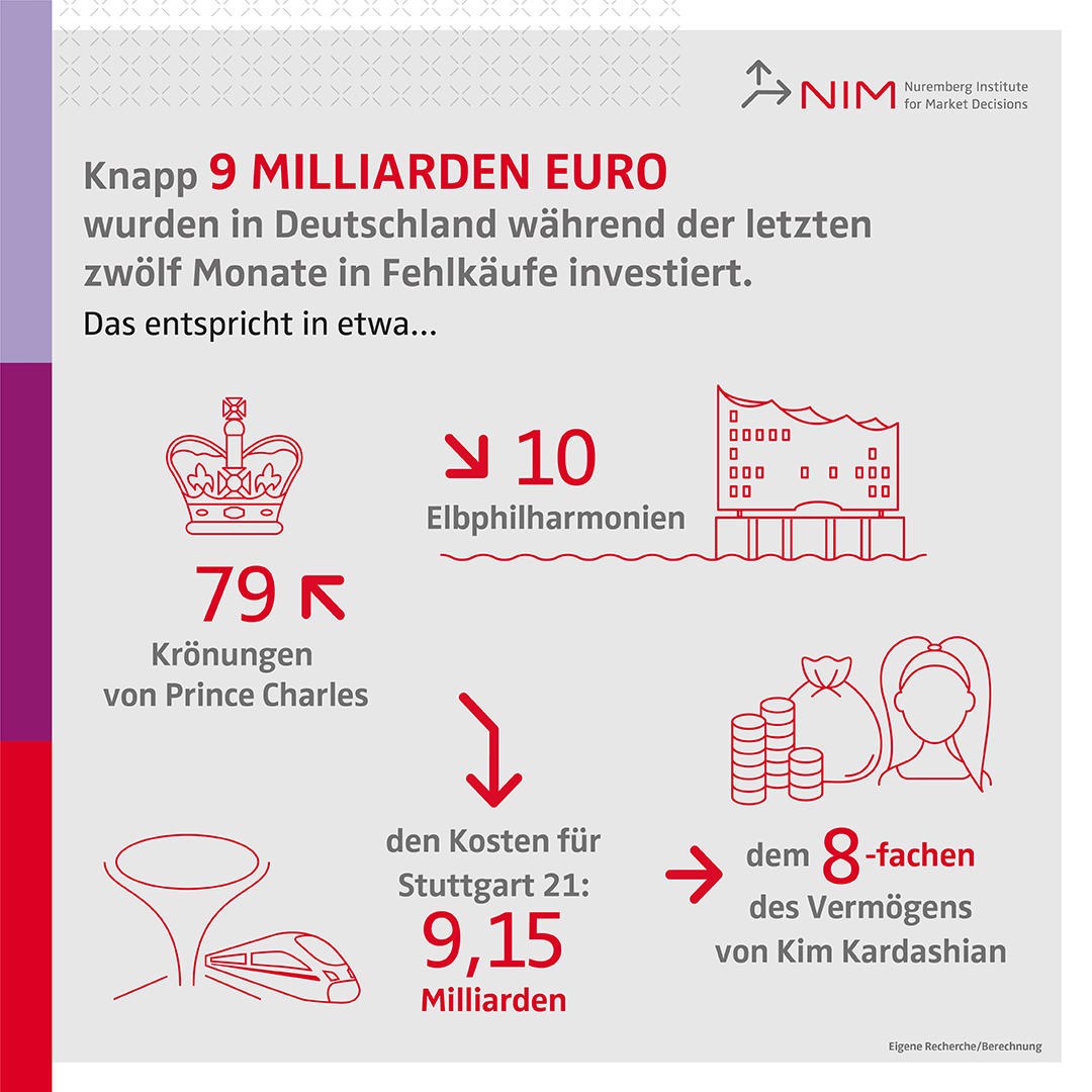 - 9 von 10 Personen in Deutschland tätigen von Zeit zu Zeit Fehlkäufe. Der finanzielle Umfang betrug in den vergangenen 12 Monaten insgesamt knapp 9 Milliarden Euro.