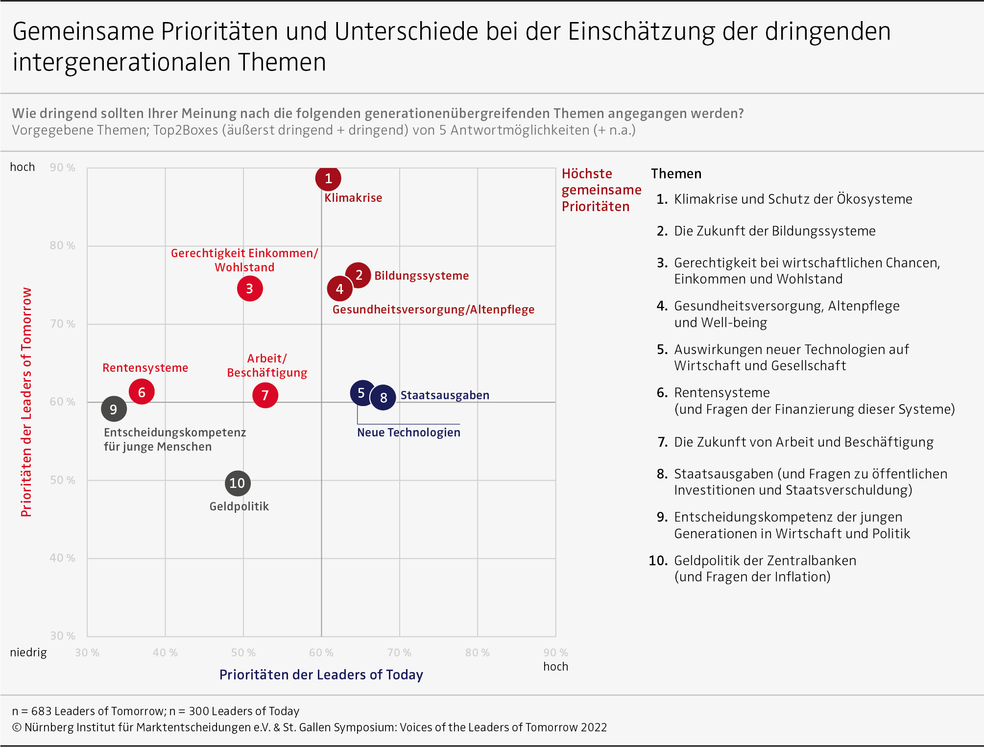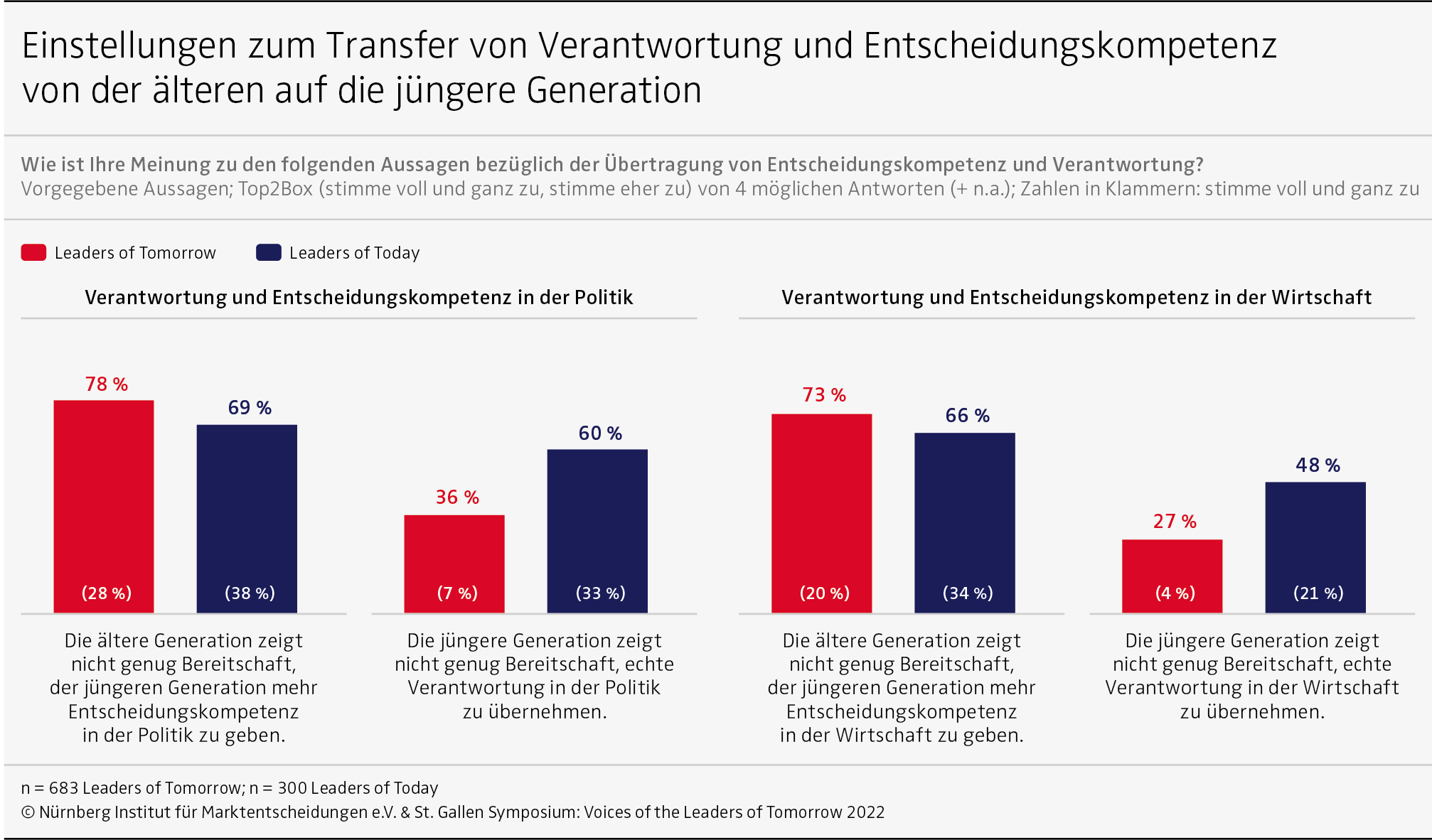 Wie stehen die Chancen für eine erfolgreiche Zusammenarbeit der Generationen? Welche Herausforderungen sollten mit höchster Priorität angegangen werden? Und wie steht es um den Transfer von Verantwortung und Entscheidungskompetenz? Um dem generationenübergreifenden Diskurs Rechnung zu tragen, wurden neben über 680 Nachwuchsführungskräften, Toptalenten und Start-up-Unternehmern aus dem Netzwerk des St. Gallen Symposiums („Leaders of Tomorrow“) auch 300 Topmanager („Leaders of Today“) aus den 2.000 größten börsennotierten globalen Unternehmen befragt.