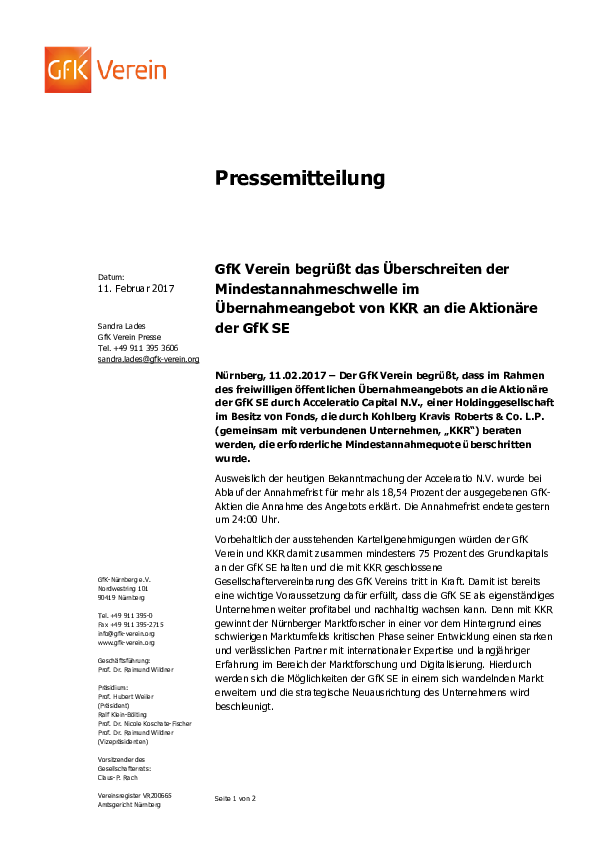 Nürnberg, 11.02.2017 – Der GfK Verein begrüßt, dass im Rahmen des freiwilligen öffentlichen Übernahmeangebots an die Aktionäre der GfK SE durch Acceleratio Capital N.V., einer Holdinggesellschaft im Besitz von Fonds, die durch Kohlberg Kravis Roberts & Co. L.P. (gemeinsam mit verbundenen Unternehmen, „KKR“) beraten werden, die erforderliche Mindestannahmequote überschritten wurde.