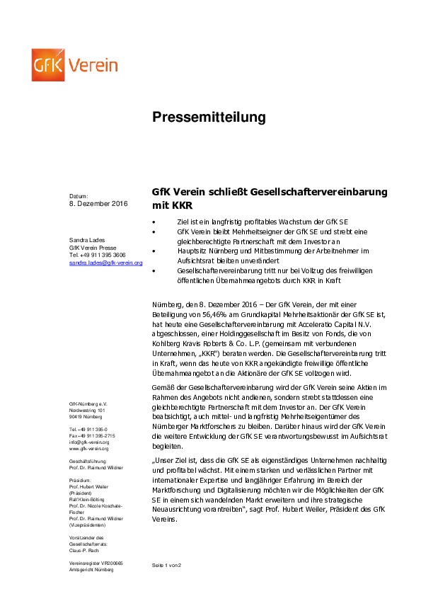 Nürnberg, den 8. Dezember 2016 – Der GfK Verein, der mit einer Beteiligung von 56,46% am Grundkapital Mehrheitsaktionär der GfK SE ist, hat heute eine Gesellschaftervereinbarung mit Acceleratio Capital N.V. abgeschlossen, einer Holdinggesellschaft im Besitz von Fonds, die von Kohlberg Kravis Roberts & Co. L.P. (gemeinsam mit verbundenen Unternehmen, „KKR“) beraten werden. Die Gesellschaftervereinbarung tritt in Kraft, wenn das heute von KKR angekündigte freiwillige öffentliche Übernahmeangebot an die Aktionäre der GfK SE vollzogen wird.