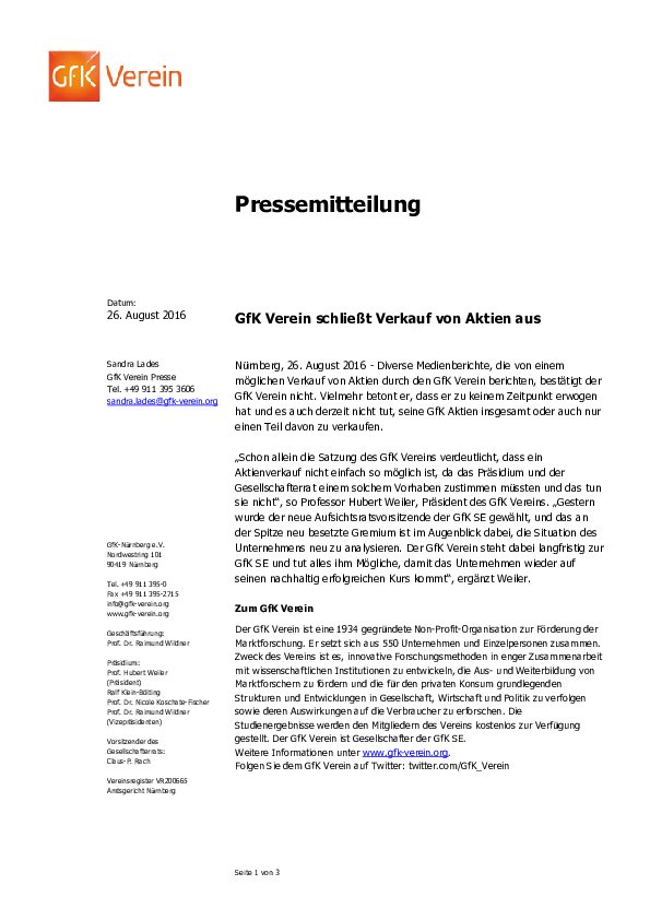 Nürnberg, 26. August 2016 - Diverse Medienberichte, die von einem möglichen Verkauf von Aktien durch den GfK Verein berichten, bestätigt der GfK Verein nicht. Vielmehr betont er, dass er zu keinem Zeitpunkt erwogen hat und es auch derzeit nicht tut, seine GfK Aktien insgesamt oder auch nur einen Teil davon zu verkaufen.