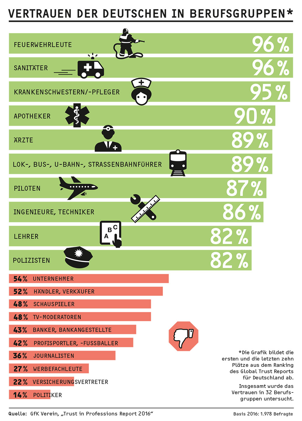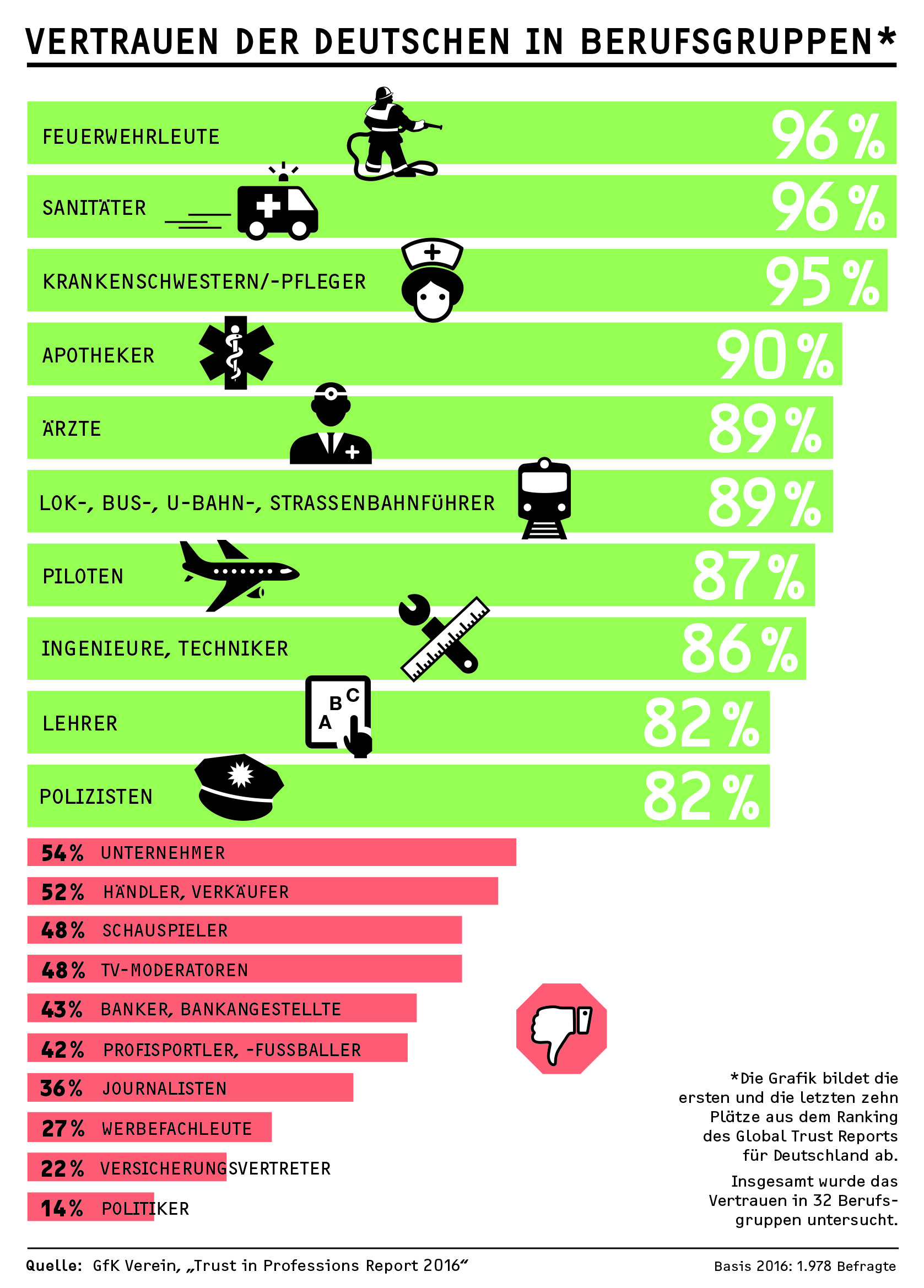 Über alle Berufe hinweg liegt der Vertrauenswert der Deutschen bei 65 Prozent – damit liegen sie beim Ländervergleich im Mittelfeld. Das größte Vertrauen schenken die Deutschen helfenden Berufen: So stehen im Vertrauensranking des GfK Vereins Feuerwehrleute, Sanitäter (jeweils 96 Prozent) und das Krankenpflegepersonal (95 Prozent) auf den vorderen Plätzen, gefolgt von Apotheker (90 Prozent) und Ärzten sowie Lok-, Bus-, U-Bahn und Straßenbahnführern (jeweils 89 Prozent). Das Vertrauen der Deutschen in diese Berufsgruppen ist seit der letzten Studie in 2014 unverändert hoch – auch damals erzielten sie ähnlich hohe Vertrauenswerte.