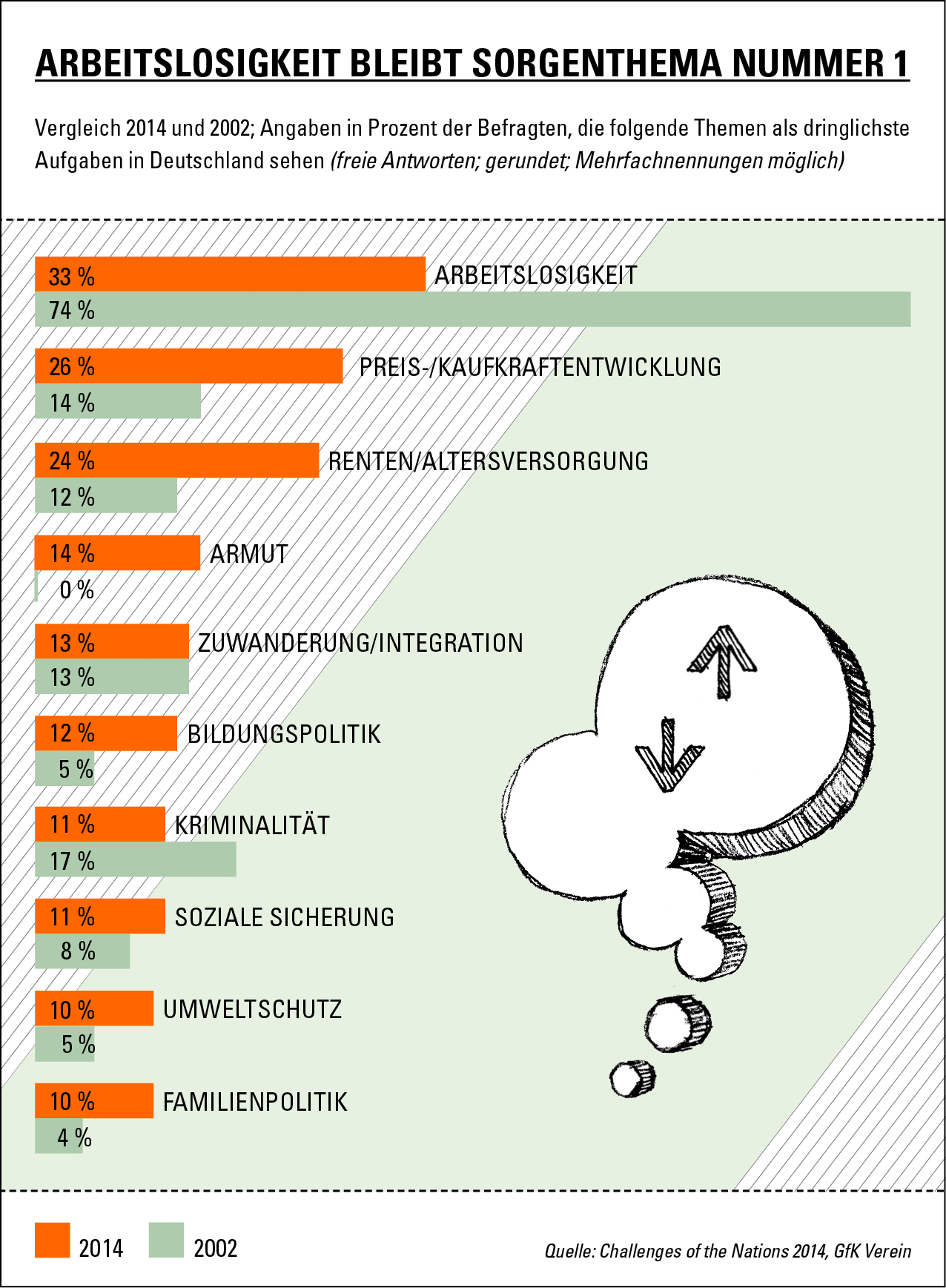 Seit mehr als 20 Jahren unangefochtener Spitzenreiter der deutschen Sorgenliste ist und bleibt die Arbeitslosigkeit: 33 Prozent nennen die Situation auf dem Arbeitsmarkt als wichtigste Herausforderung. Allerdings hat sich der Wert seit dem Krisenjahr 2009 halbiert – damals betrug er noch 66 Prozent. Auch die tatsächliche Arbeitslosenquote nach dem internationalen ILO-Standard war im Februar 2014 mit 5,1 Prozent so niedrig wie seit 20 Jahren nicht mehr. Dabei ist die Besorgnis mit 40 Prozent in den Neuen Bundesländern weiterhin präsenter als im Westen mit 32 Prozent. Erklären lässt sich dies durch eine rund vier Prozentpunkte höhere Arbeitslosenquote im Osten.